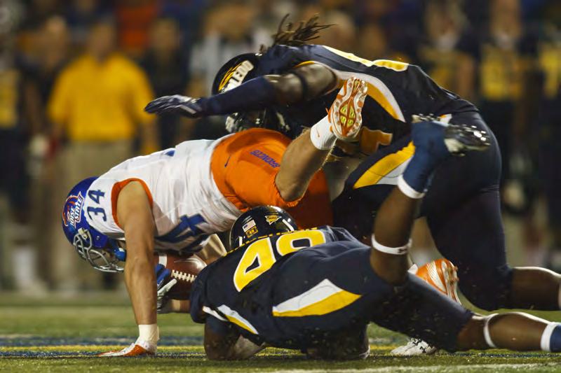 Christian Smith and Terrell An-derson (49) trip up Boise State’s Kirby Moore.