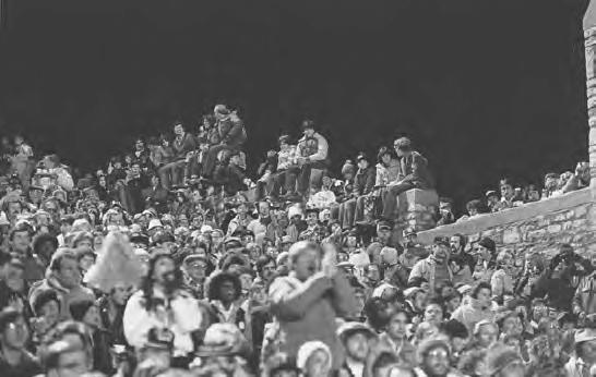 the seats and locker rooms, and to install perma-nent fencing that enclosed the entire stadium. A new $120,000 electronic message board fol-lowed in 1975. In 1978, a new lighting system was installed. In 1979, an extensive concrete replacement, in addition to new restrooms and concession stands, was built on the west side. Improvements to the stadium and the in-crease in seating capacity could not keep pace withdemand, however. Jammedwith standing-room-onlycrowds, spectatorsheadedforhigher ground and at many games ended up sitting on the stone wall surrounding the feld. In fact, UT led thenation inpercentageof attendance from 1982-84 and had an incredible rating of 135.1 percent in 1982. One of the most memorable games was the Bowling Green contest on Oct. 23, 1982, when 31,369 people jammed into the Glass Bowl to see the Rockets’ 24-10 victory.