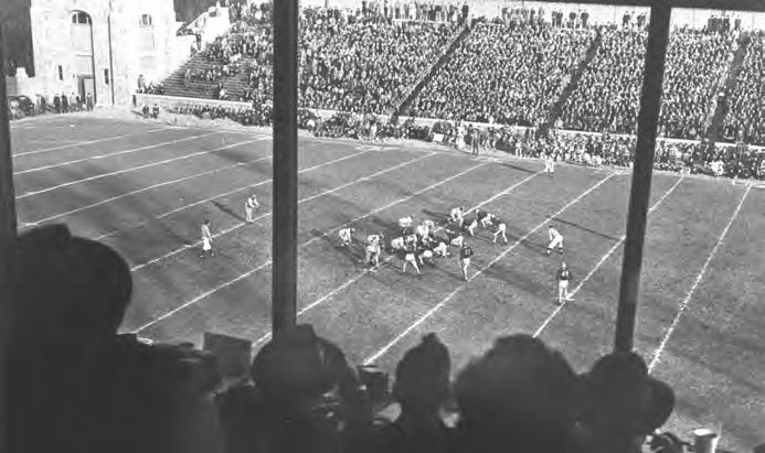 A viewof the 1946Glass Bowl Game vs. Bates College fromthe old press box. Bates showed up in home whites, forcing the Rockets to borrow blue jerseys from the University of Michigan for the contest.