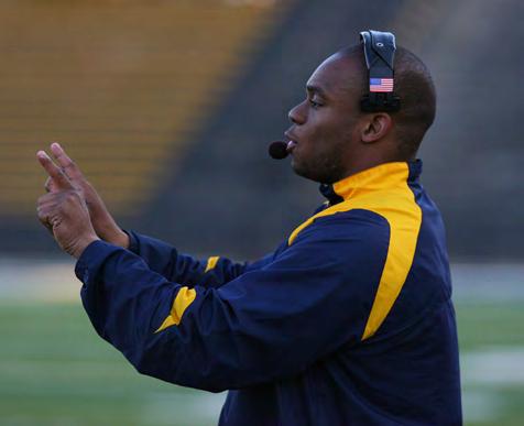 As the run-game coordinator in 2011, Ayeni guided a UT running attack that fnished fourth in the MAC, averag-ing 213.6 yards per game. The running game peaked against Western Michigan when the Rockets ran for 419 yards and fve TDs. For the season, seniors Adonis Thomas and Morgan Williams combined for 1,772 yards and 23 TDs. Thomas had 1,071 yards despite missing most of three games with a bro-ken arm. He led the MAC with a 6.3 rushing average, and was named second team All-MAC for the second straight year. Toledo’s running attack helped propel the Rockets to a 9-4 record and its frst bowl victory in six years.